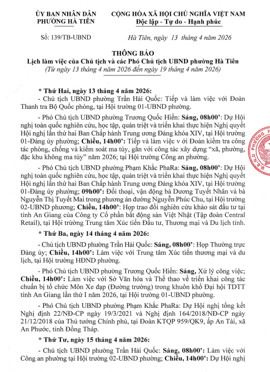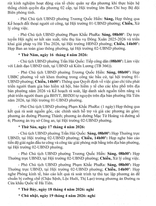 aA Lịch làm việc của thường trực HĐND và UBND Thành phố Lịch làm việc của Chủ tịch và các phó Chủ tịch tuần 3 tháng 4 năm 2026 14/04/2026, 11:05 Quay về Chia sẻ Z Copy link thành công Tin khác Lịch làm việc của CT và các PCT tuần 4 tháng 3/2026 Lịch làm việc của thường trực HĐND và UBND Thành phố 24/03/2026 Lịch làm việc của CT và các PCT tuần III tháng 3.2026 Lịch làm việc của thường trực HĐND và UBND Thành phố 19/03/2026 Lịch làm việc của Chủ tịch và các Phó Chủ tịch UBND phường Hà Tiên (từ ngày 02 tháng 3 năm 2026 đến ngày 08 tháng 3 năm 2026) Lịch làm việc của thường trực HĐND và UBND Thành phố 02/03/2026 Lịch trực của chủ tịch và các phó chủ tịch tuần 4 tháng 2/2026 Lịch làm việc của thường trực HĐND và UBND Thành phố 24/02/2026 Lịch làm việc của chủ tịch và các phó chủ tịch tuần II-2/2026 từ ngày 08-15/02 Lịch làm việc của thường trực HĐND và UBND Thành phố 10/02/2026 Lịch làm việc của Chủ tịch và các Phó Chủ tịch tuần I-Tháng 12 Lịch làm việc của thường trực HĐND và UBND Thành phố 10/12/2025 Lịch làm việc của Chủ tịch và các Phó Chủ tịch UBND thành phố Hà Tiên (Từ ngày 21/10/2024 đến 25/10/2024) Lịch làm việc của thường trực HĐND và UBND Thành phố 21/10/2024 Lịch làm việc của Chủ tịch và các Phó Chủ tịch UBND thành phố Hà Tiên (Từ ngày 16/9/2024 đến20/9/2024) Lịch làm việc của thường trực HĐND và UBND Thành phố 16/09/2024 Lịch làm việc của Chủ tịch và các Phó Chủ tịch UBND thành phố (Tù ngày 04/9/2024 đến 13/9/2024) Lịch làm việc của thường trực HĐND và UBND Thành phố 16/09/2024 Lịch làm việc của Chủ tịch và các Phó Chủ tịch UBND thành phố Hà Tiên (Từ ngày 26/8/2024 đến 30/8/2024) Lịch làm việc của thường trực HĐND và UBND Thành phố 28/08/2024 /lich-lam-viec-cua-chu-tich-va-cac-pho-chu-tich-tuan-3-thang-4-nam-2026